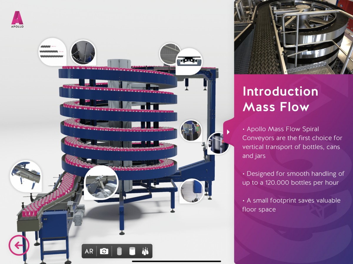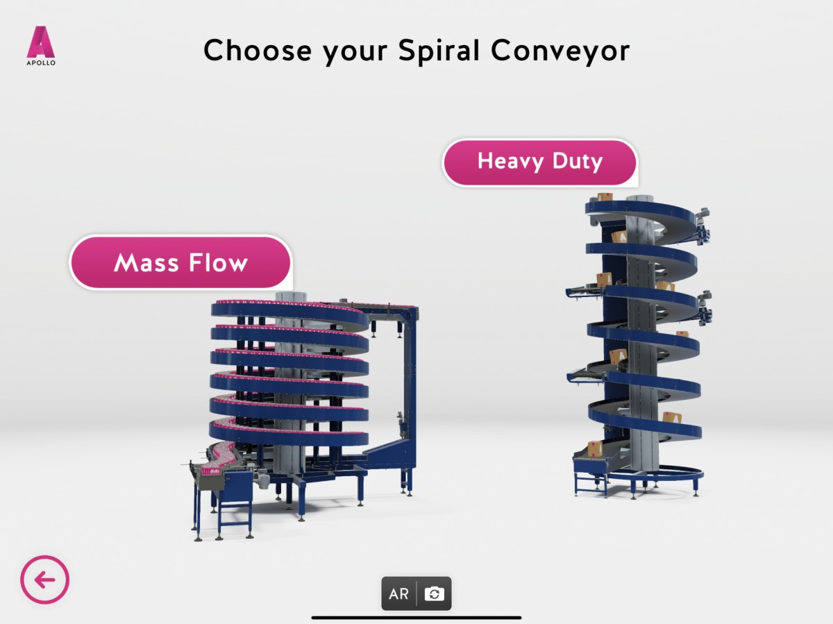 From the products that the Apollo Group produces we showed a subset of the conveyors in an iPad pro app.In this app a sales representative can present a 3d view of the Single Lane Spiral Conveyor and the Heavy Duty Spiral Conveyor.